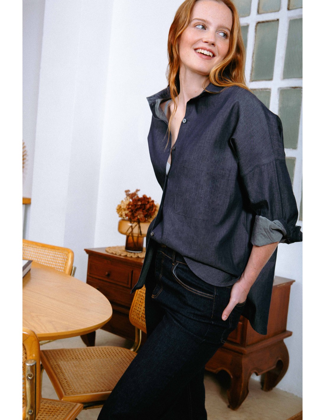 Camisa estampada con cuello mao acabado en volantes, mangas abullonadas y abotonada al centro. Look romántico que destaca por los detalles y print tie dye.
